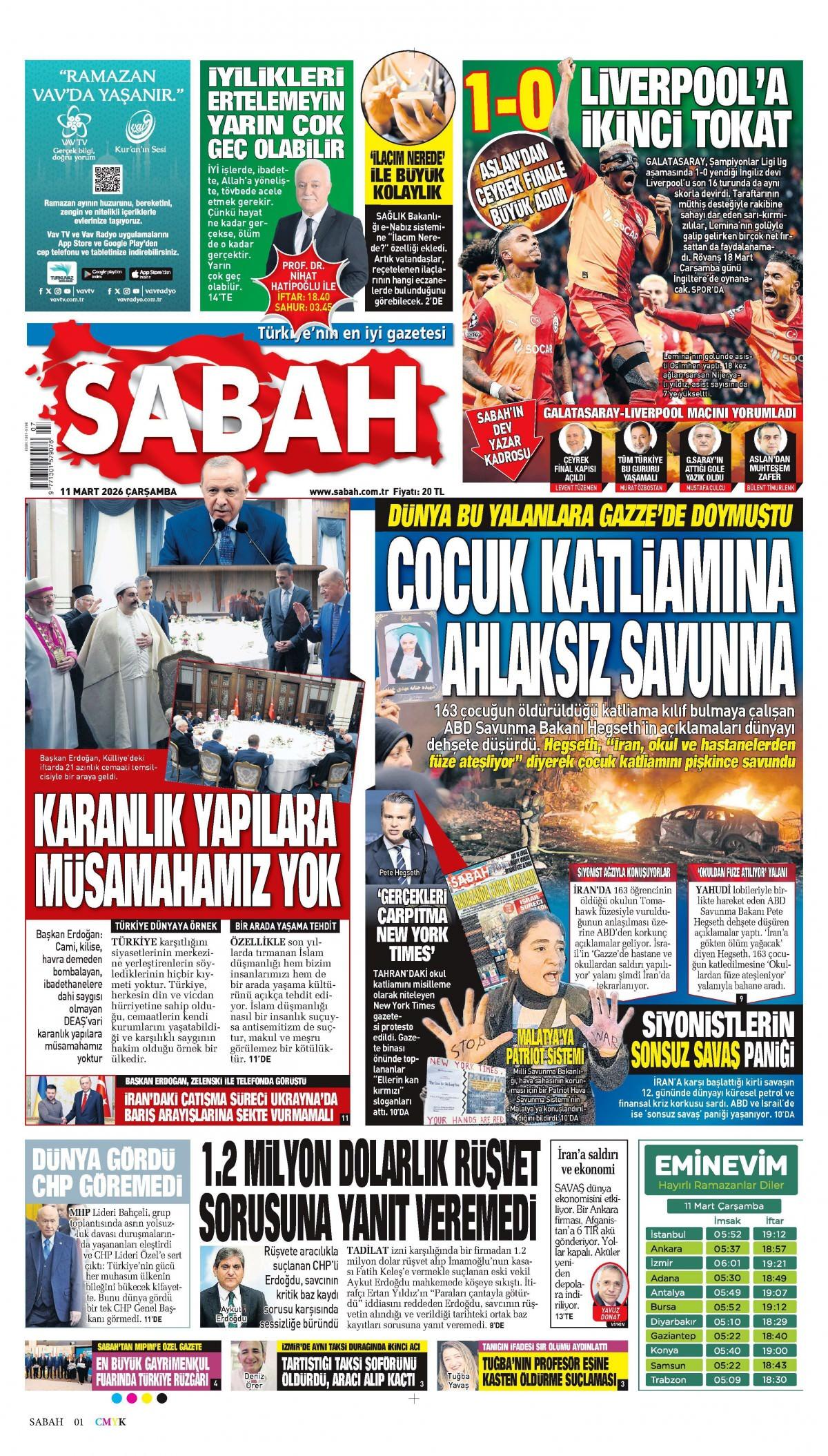 Sabah Gazetesi 12 Mart 2026, Perşembe Günü Gazete Manşetleri